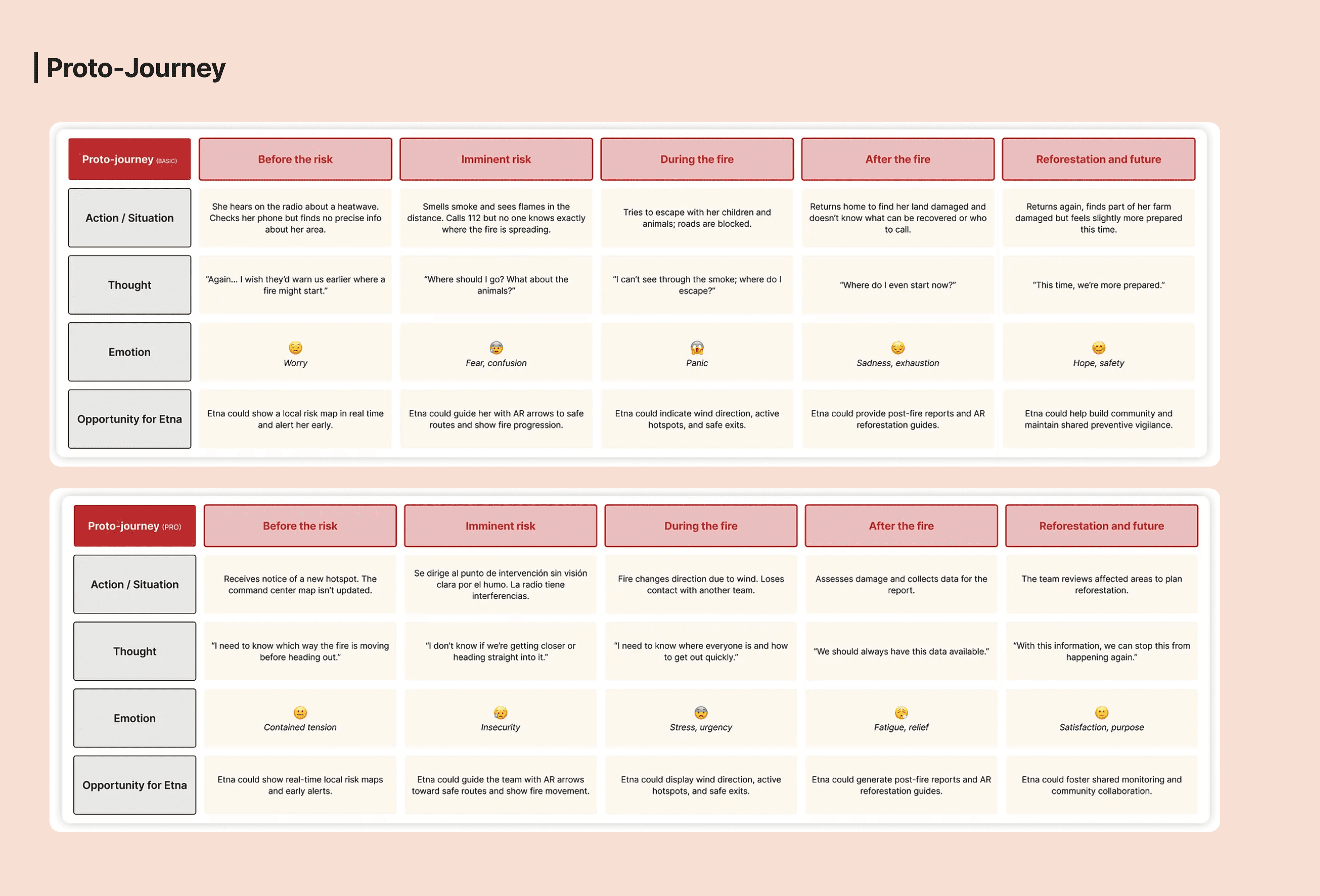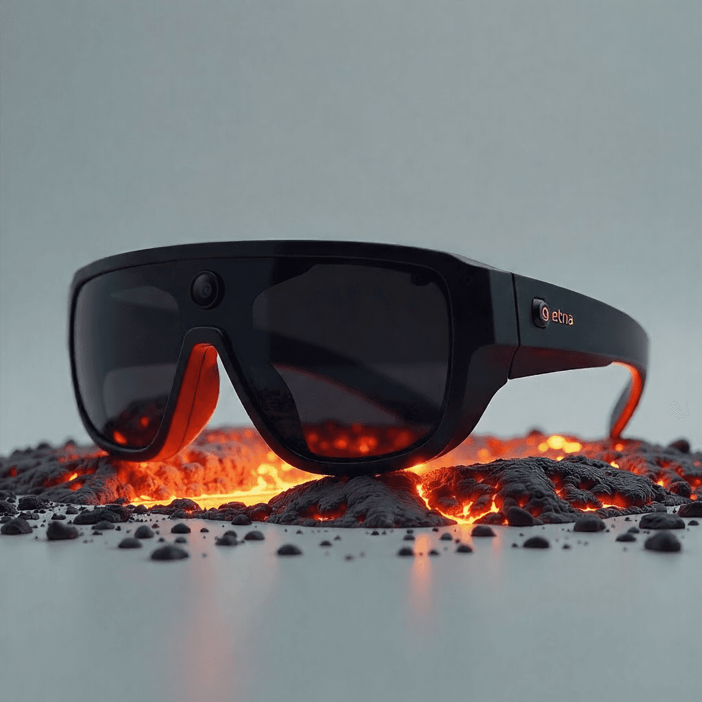 Etna consists of lightweight smart glasses equipped with sensors (temperature, humidity, wind, gases), a real time camera for hotspot detection, voice interaction for hands free tasks and AR overlays that display risk zones, safe routes and nearby resources.