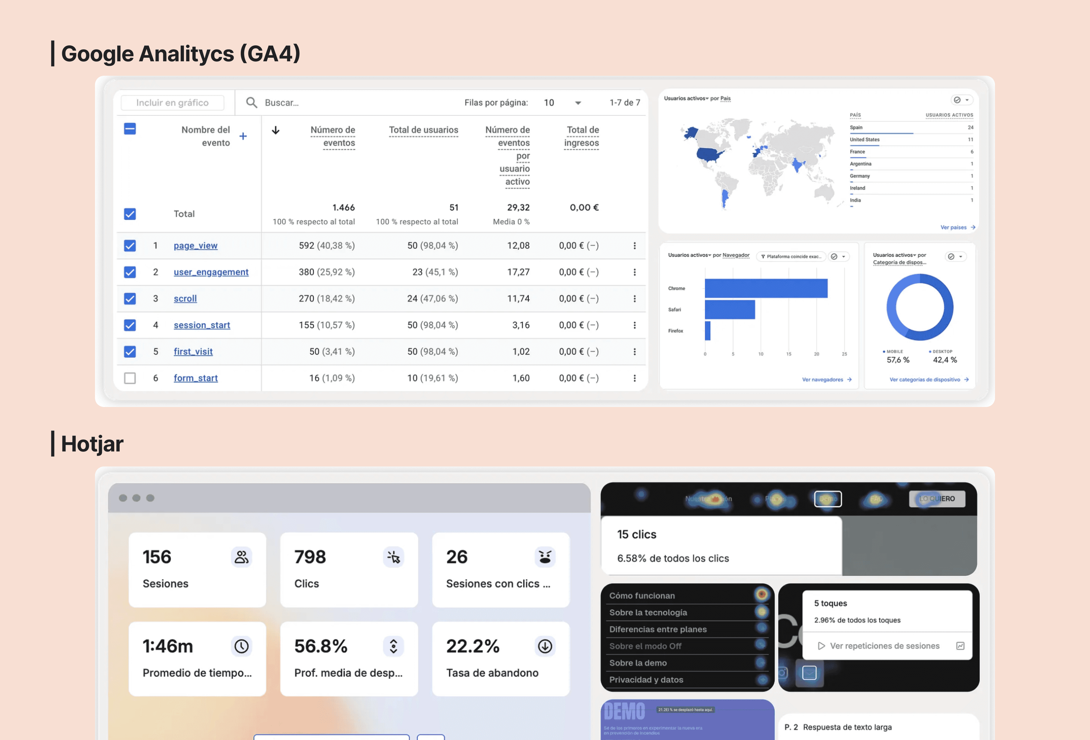 The landing was published without paid campaigns to observe organic interest and comprehension, using GA4 and Hotjar to track engagement and behavior. Early signals show strong exploration and scroll depth, with mobile as the primary device. While form completion was low, indicating friction or technical issues, it is still early to draw final conclusions. Ongoing monitoring and iteration will help validate trends and guide next improvements.