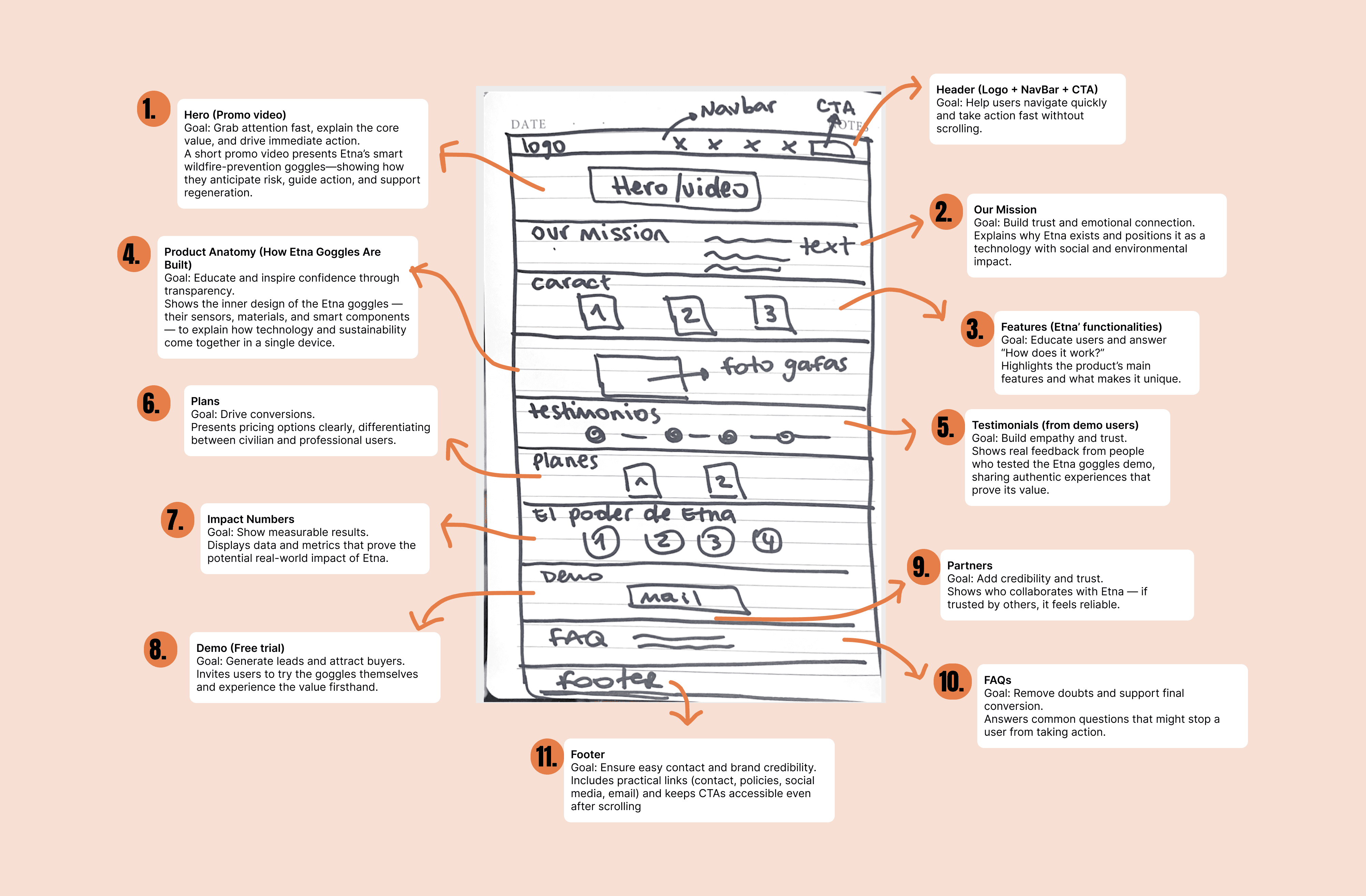 Etna is a two week UX UI academic project where I designed an AI powered smart glasses concept to anticipate wildfires, support field teams and contribute to land regeneration. I defined the product vision, shaped its business model and built a high fidelity MVP landing page in WordPress to test interest and comprehension with real users.