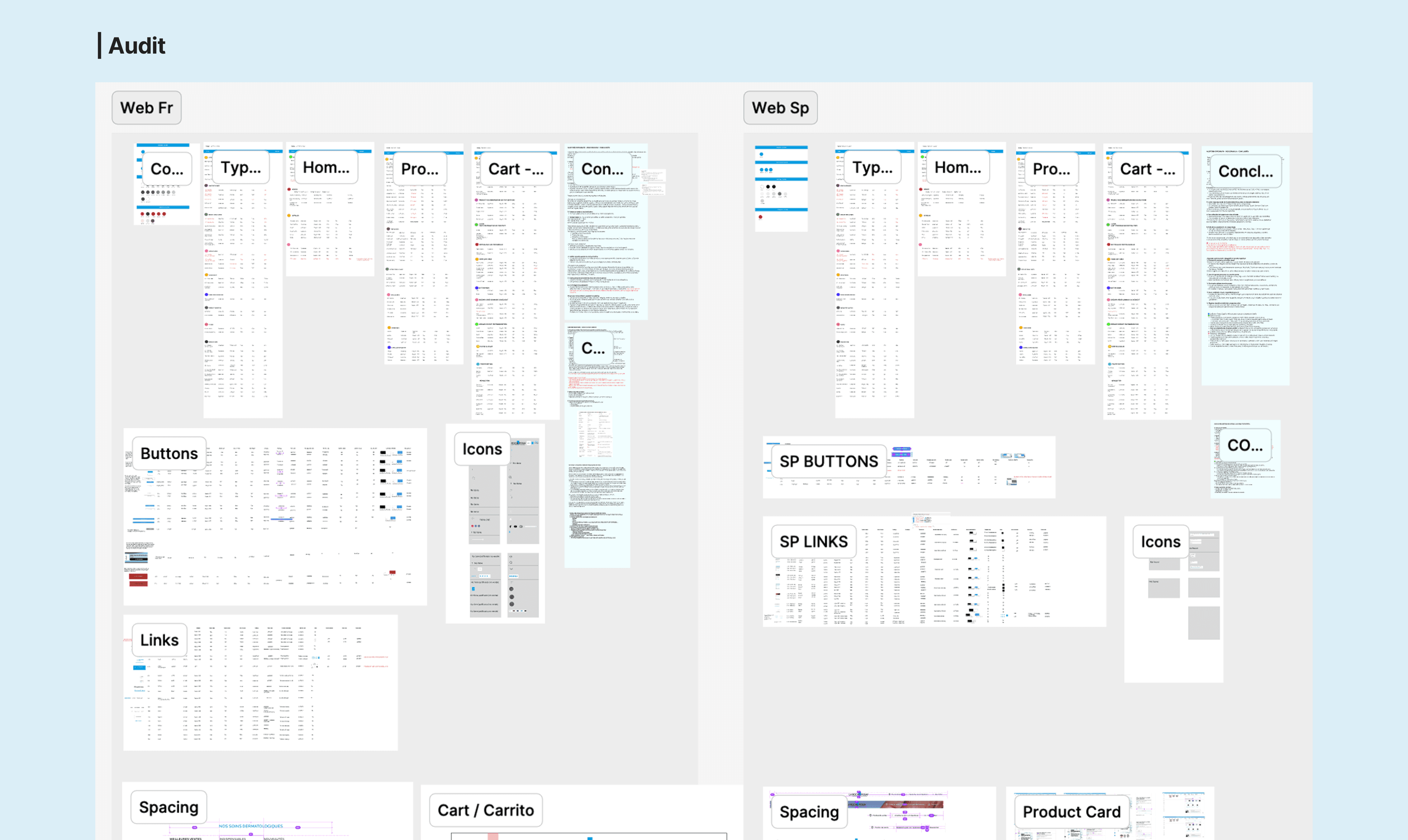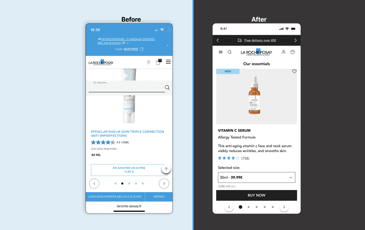 We selected La Roche-Posay after identifying major inconsistencies across its French and Spanish digital platforms. The brand operated without a unified Design System: each market used different visual languages, component structures and interaction patterns, and even within the same site, UI logic was often fragmented. Because we did not have access to the brand’s internal design system or documentation, all research and auditing had to be conducted externally, based solely on what was publicly available.