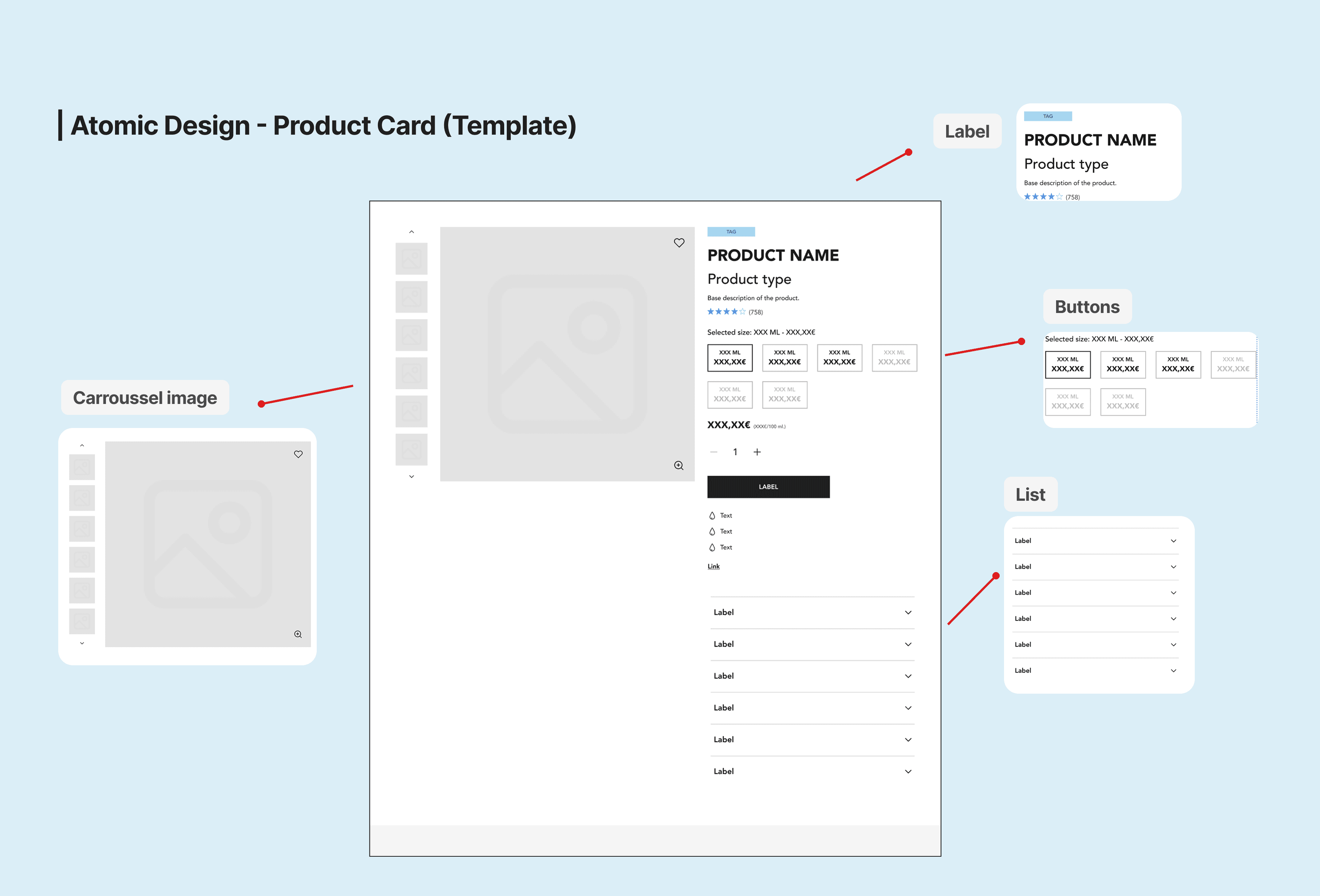 Atoms (buttons, icons, inputs) combine into molecules (dropdowns, tooltips), which scale into organisms (headers, product modules). These structures then form templates and full pages, allowing us to validate cohesion in real market contexts.