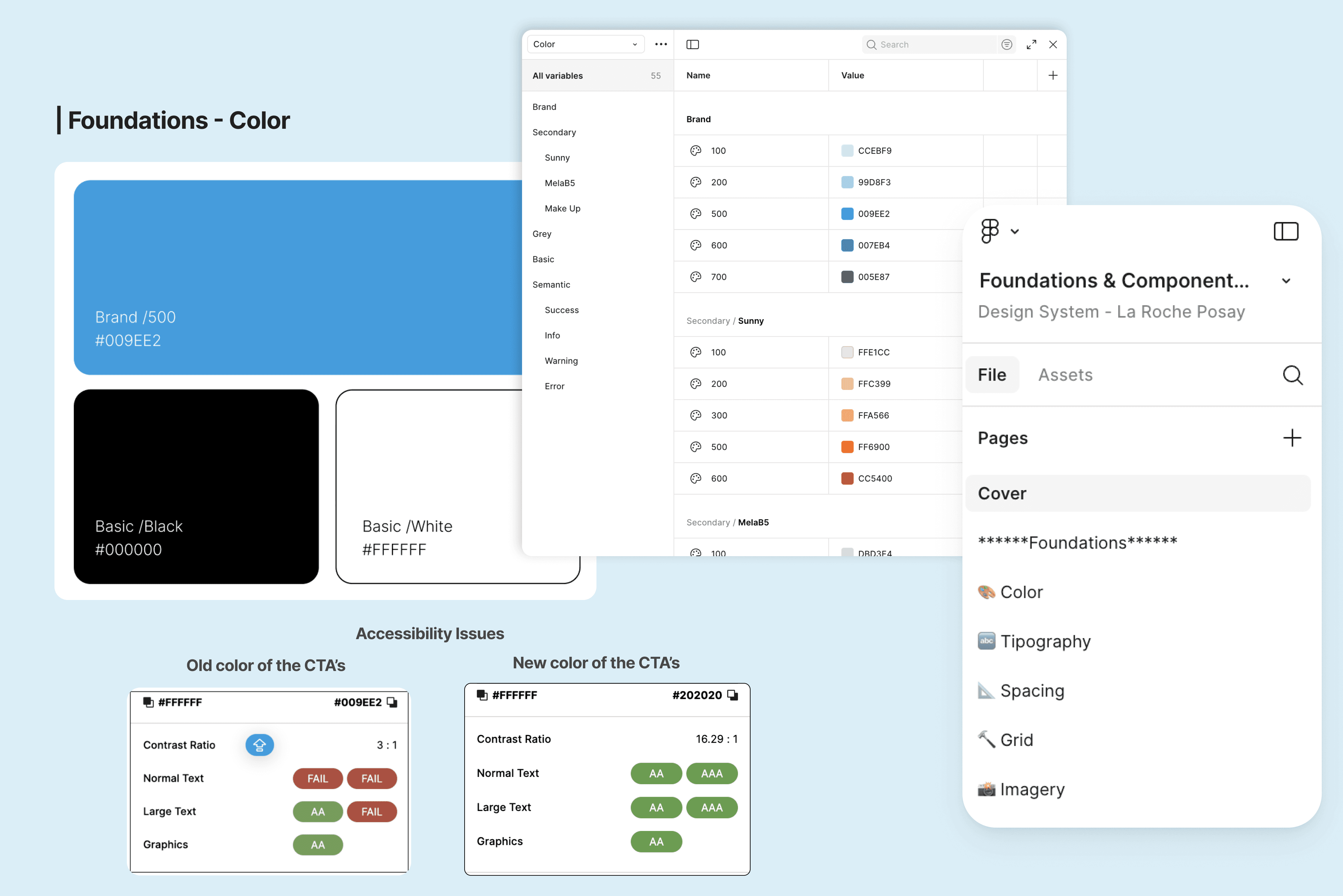 We proposed a unified, accessible palette. Since La Roche-Posay’s signature blue does not meet WCAG contrast requirements, we introduced a dark color for actions and text, keeping the brand blue for identity and expressive use.