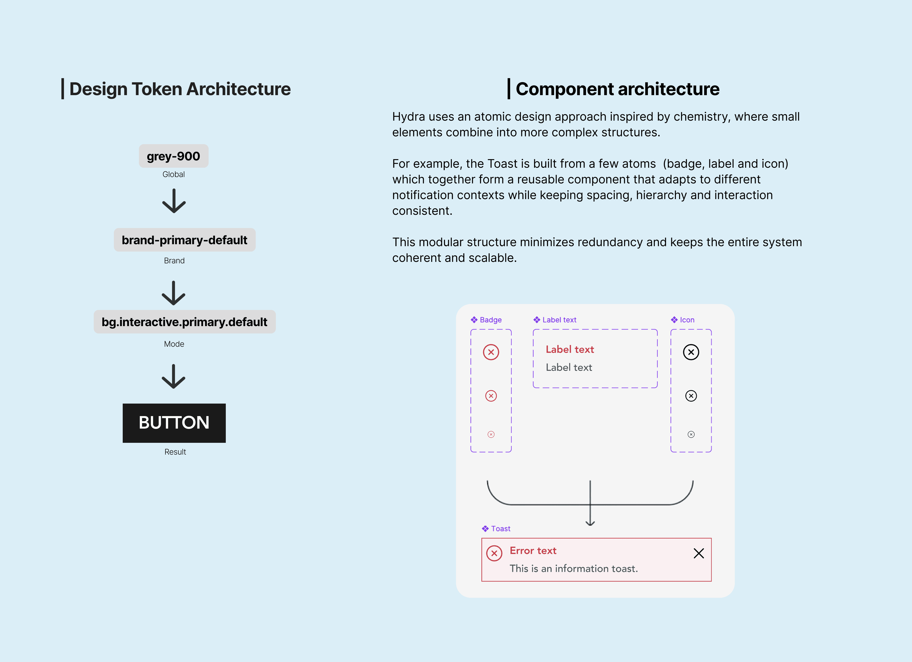 To ensure clarity and autonomy across teams, we created a dedicated Figma file focused exclusively on documentation. It outlines Hydra’s principles, usage guidelines and component behaviors, supported by examples and best practices that help designers understand not only what to use, but how and why.
